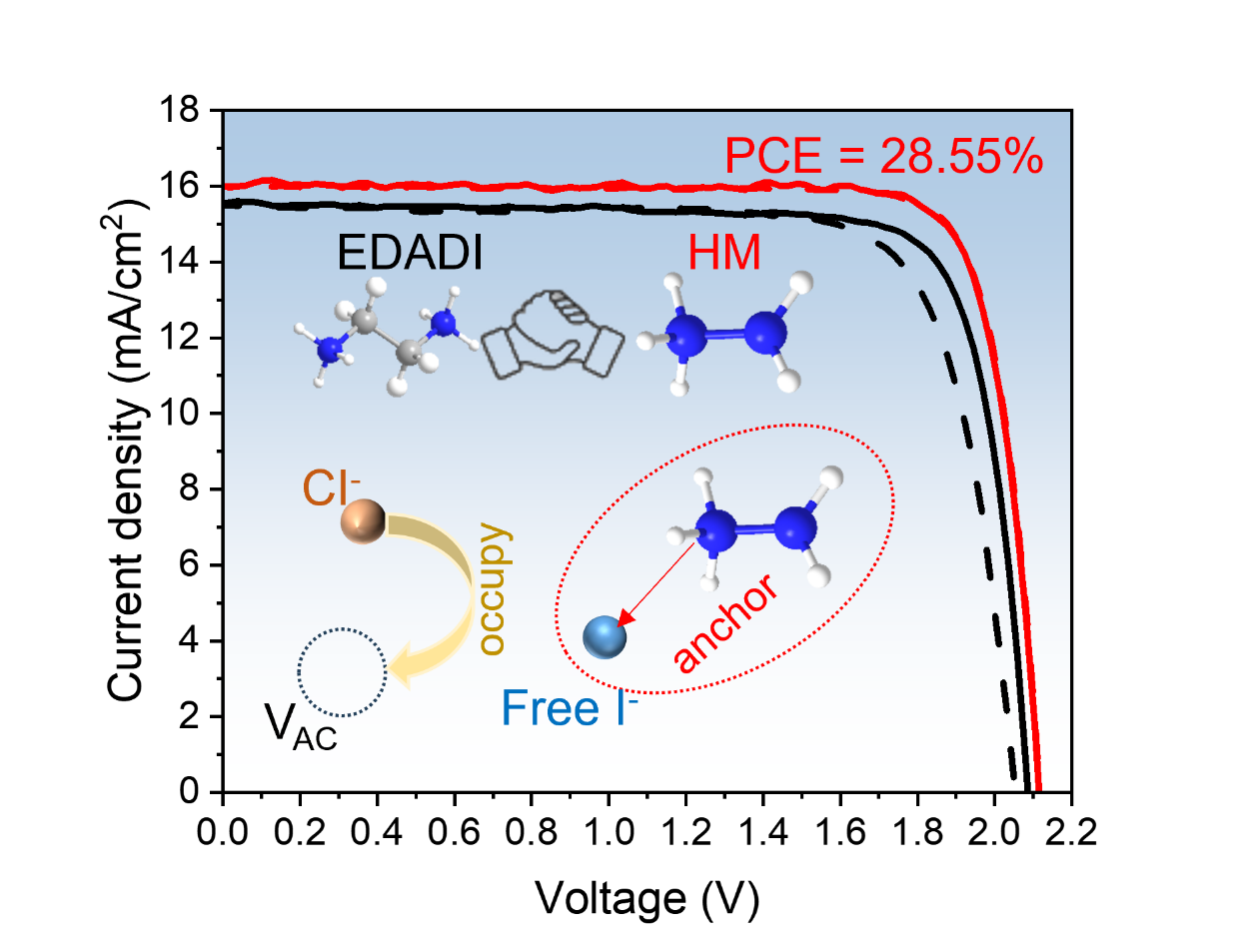 摘要:锡铅混合(Sn-Pb)窄带隙钙钛矿太阳能电池(PSCs)因缺陷密度高而导致性能不佳。传统工作通常采用乙二胺碘(EDADI)作为表面钝化材料来减少缺陷以提升器件的光伏性能,但该材料会在顶部界面引发过量的离子迁移,导致严重的回滞现象。本文报道了一种抑制离子迁移的新策略,即采用盐酸肼(HM)作为体钝化剂锚定窄带隙钙钛矿中的游离离子。HM中的质子化肼(N2H5+)与碘离子(I–)形成氢键,同时氯离子(Cl–)占据I–空位,协同阻碍了I–迁移,从而有效缓解了EDADI引发的离子迁移型回滞问题。HM掺杂与EDADI后处理的协同策略显著抑制了Sn2+氧化,降低了陷阱密度,并延缓了钙钛矿的快速结晶。最终,本研究制备了高性能的窄带隙钙钛矿太阳能电池,最高效率达到23.21%。将其与宽带隙子电池结合构建全钙钛矿叠层太阳能电池,获得了28.55%的高效率(认证效率为28.31%),且回滞现象可忽略不计。