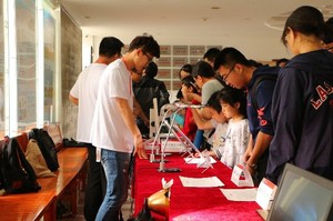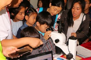高倍率体视显微镜,3D打印机吸引了众多青少年参观者,在志愿者的引导下纷纷自己动手调节显微镜,兴致盎然的询问3D打印机是怎么打印出这些立体小模型的。超级智能终端Visionboard是实验室产业化成果,来自企事业单位参观者对其产生了浓厚的兴趣。